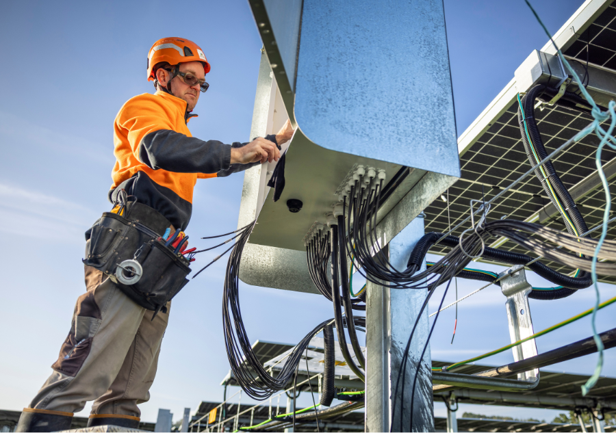 A technician works on the combiner box during the solar farm's construction phase